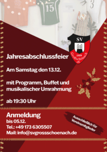 13/12/2025Jahresabschlussfeier13/12/2025Der Sportverein Großschönach veranstaltet in diesem Jahr am Samstag den…